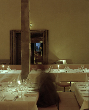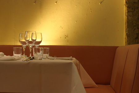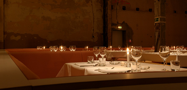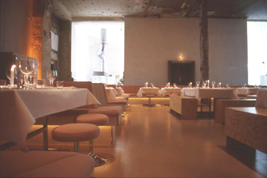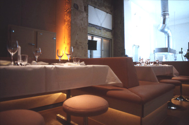 Laura V Rave designed the Cookies club related vegetarian restaurant Cream in collaboration with Soeren Roehrs. In the middle of completely bare space is a framed dining stage with white clothed tables stylishly laid for dinner.Warm, subtle lightning, a steamy open kitchen and a fresh mix of music from the DJ booth blend to produce a relaxed, intimate atmosphere of cool understatement.