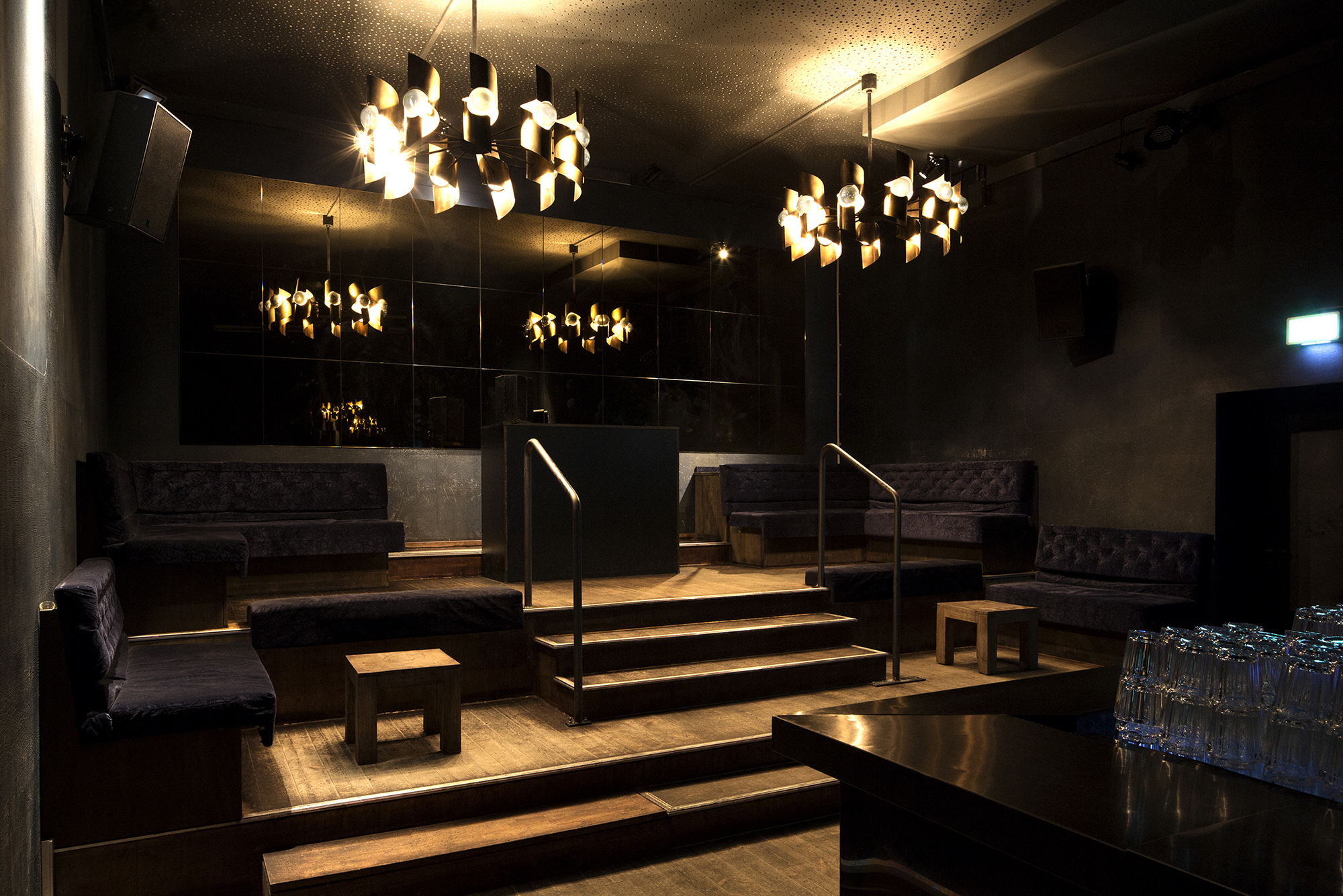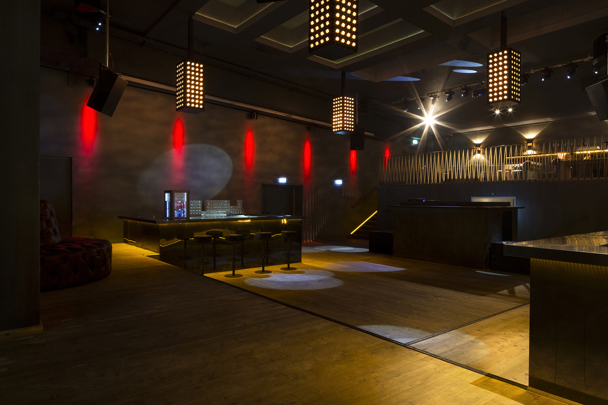 Entering through a neon lit 1950s shopping mall in Munich, the Jack Rabbit club is situated in a former cinema. Laura V Rave designed the interior concept for this high-end nightclub with two floors, VIP area, and a gallery lounge. A mix of wide open spaces for dancing, and more intimate smaller spaces mark the spatial concept for the club. Patinated materials combined with shiny surfaces and gold shimmering light create an atmosphere of cool elegance.